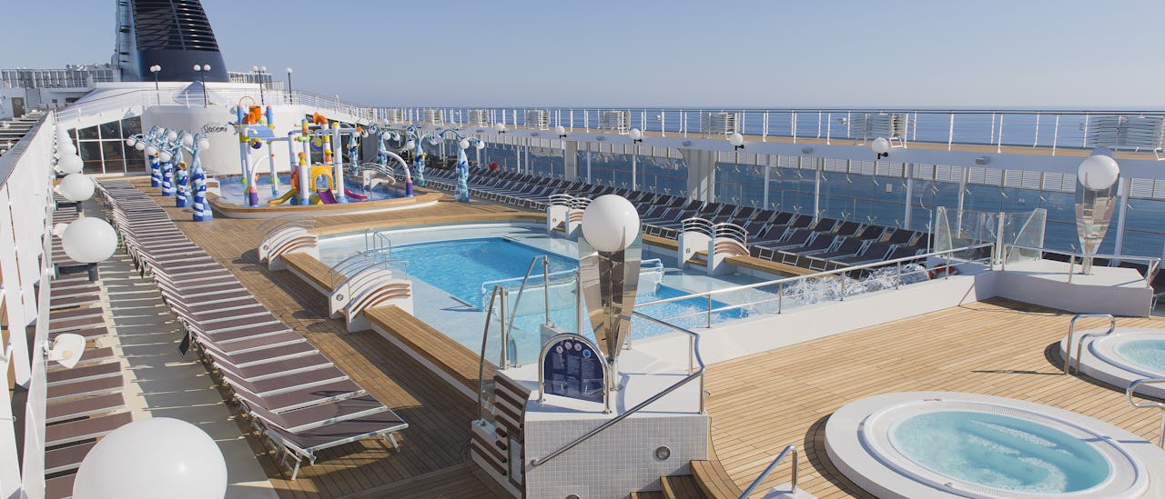 Yläkansilla odottavat monet ihanat uima- ja porealtaat, kuntosali ja kylpyläosasto.