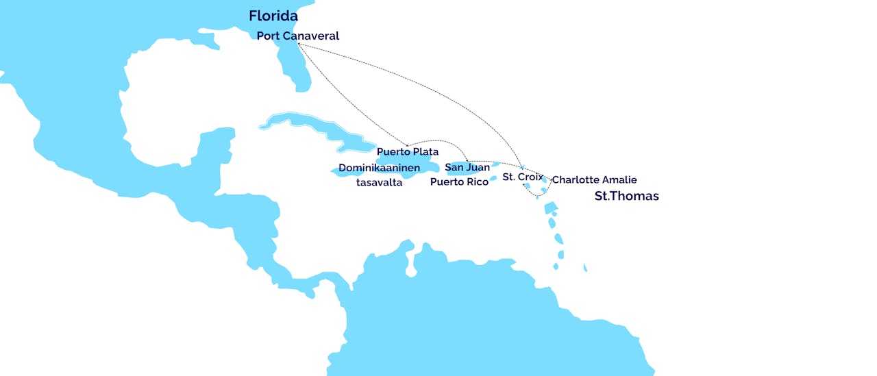 Port Canaveral (Orlando) - Merellä - Puerto Plata - San Juan - Charlotte Amalie - St Croix- Merellä - Merellä - Port Canaveral (Orlando)