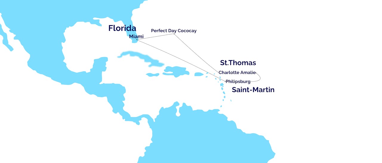 Miami - Merellä – Merellä - Philipsburg - Charlotte Amalie – Merellä – Perfect Day Cococay – Miami